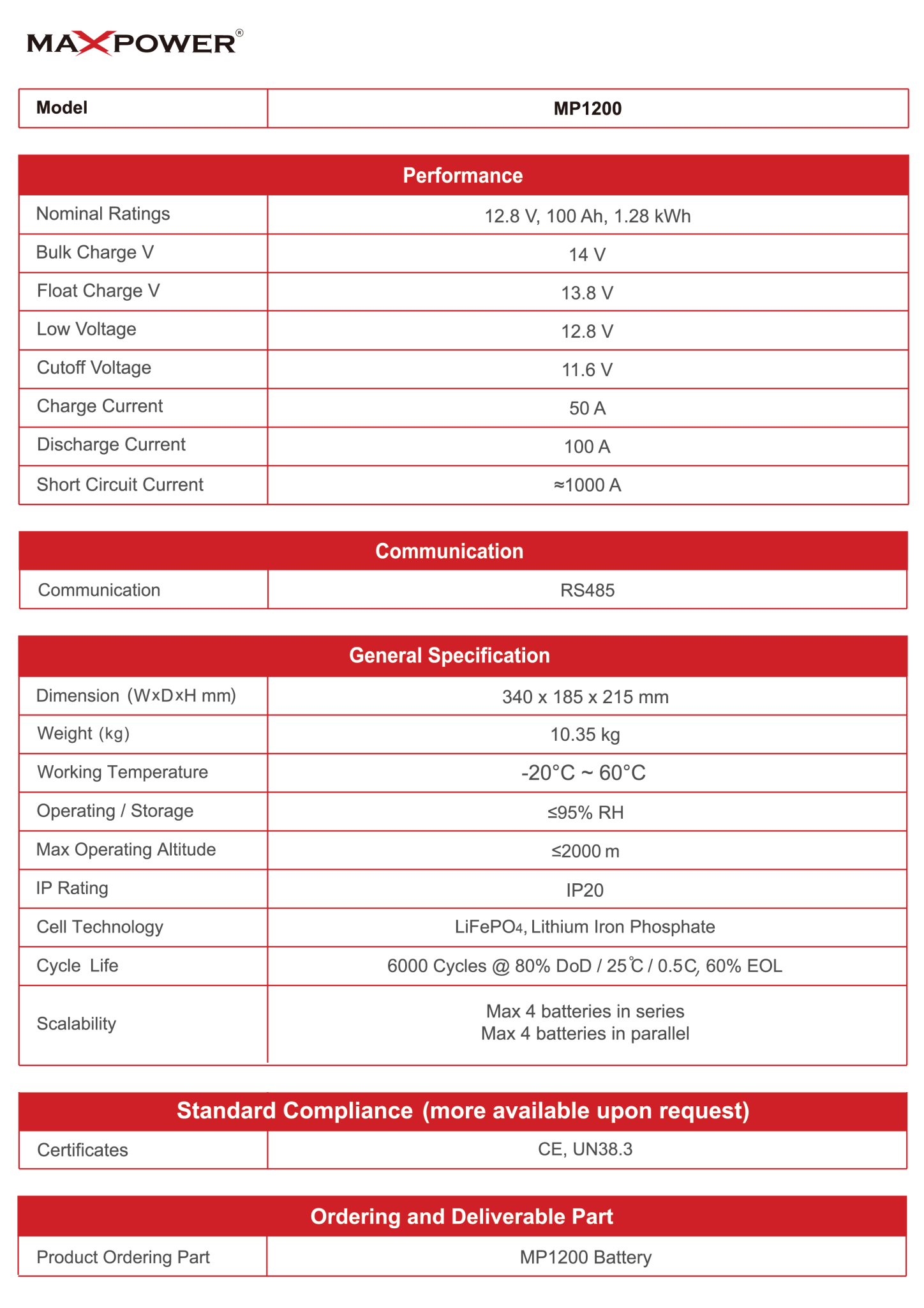 Nominal Rating 12.8V, 100Ah, 1.28KWh