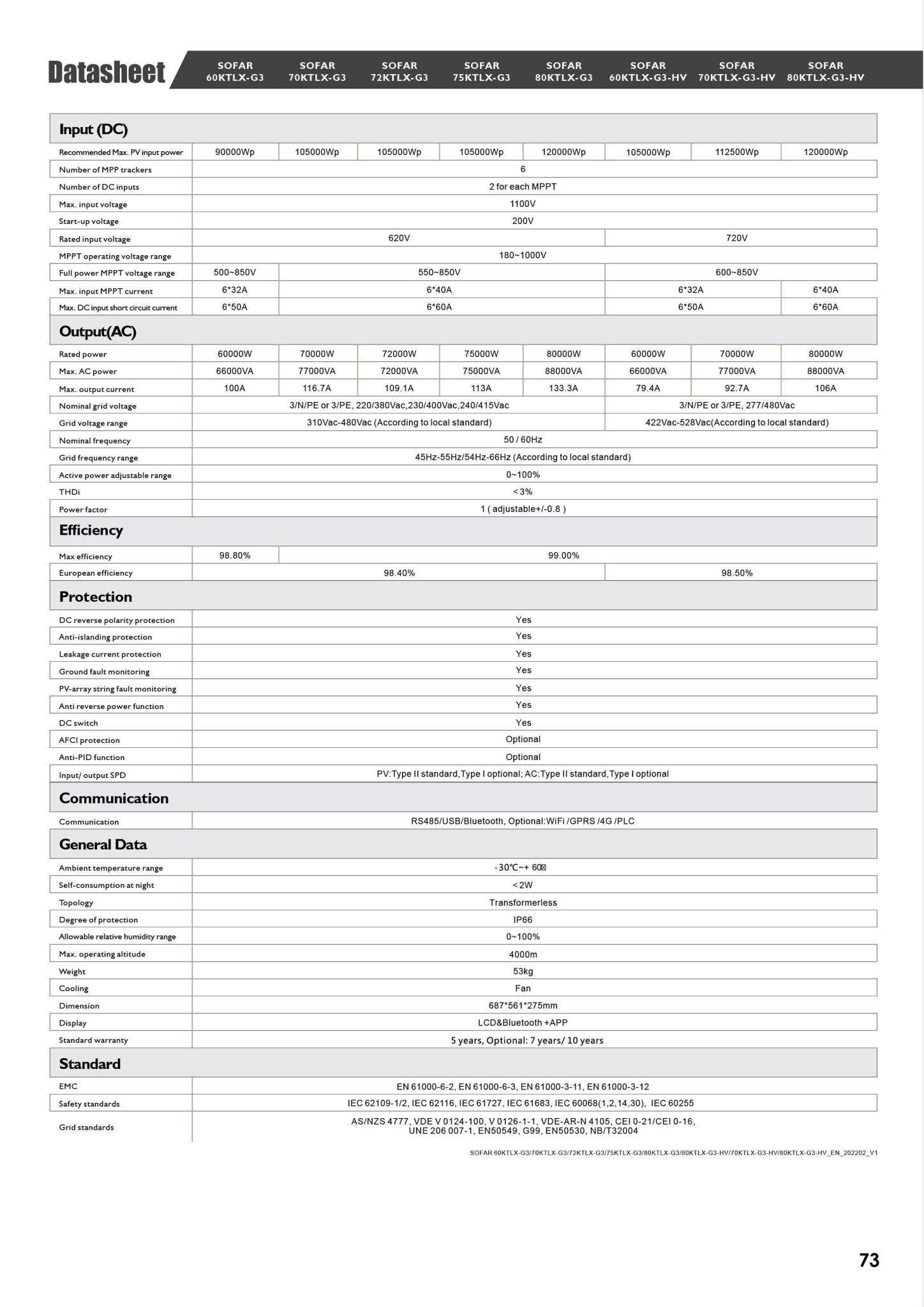 The Sofar 60K/80KTLX-G3 Three-Phase on-Grid Inverter is an ideal choice for commercial solar installations in Pakistan. Available in 60 kW and 80 kW models, it supports high energy generation with a maximum PV input power of 90,000 W and 120,000 W, respectively.
