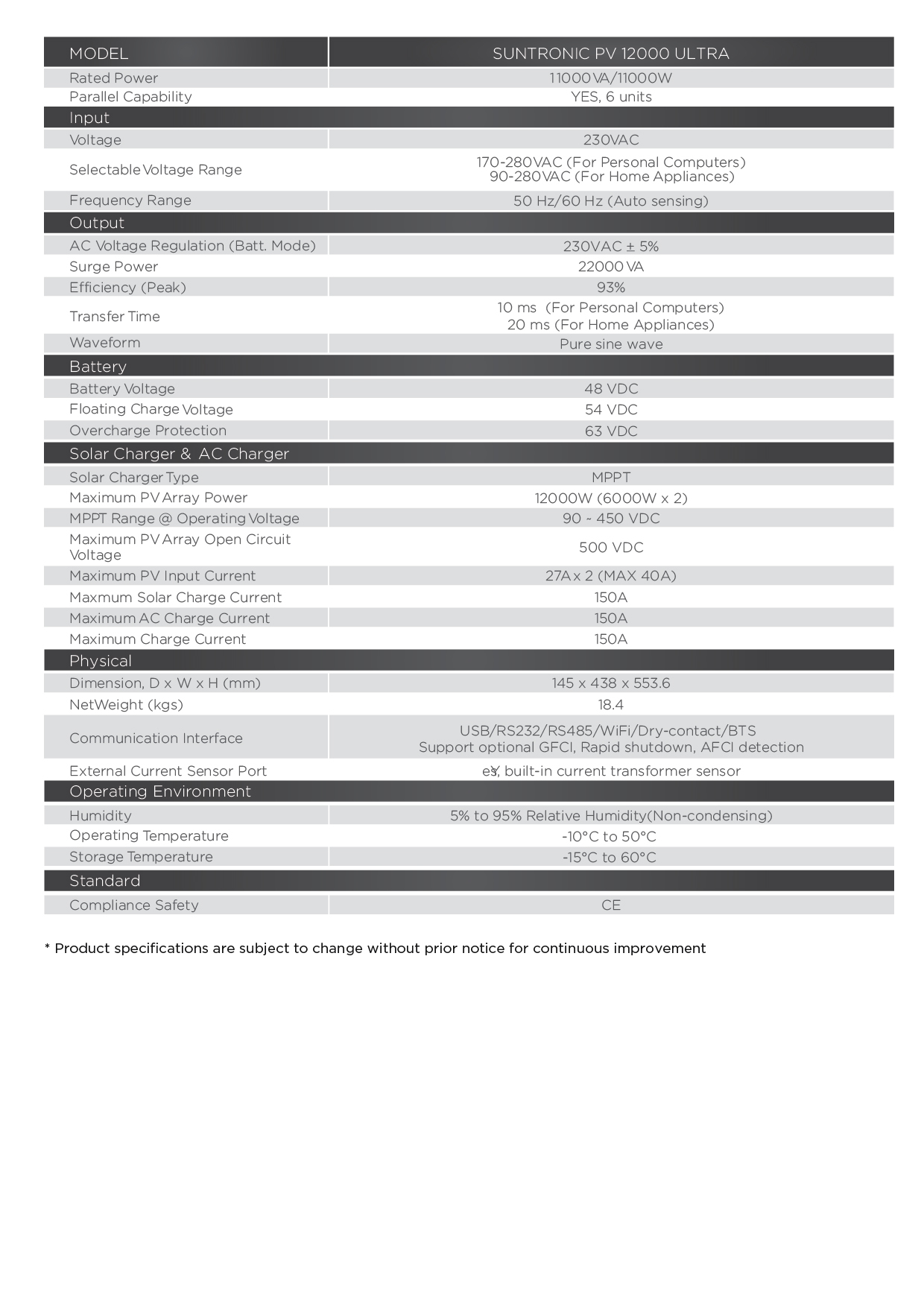 The Suntronic PV 12000 Ultra is a cutting-edge solar inverter for exceptional energy management. It boasts a rated power of 11000VA/11000W and can be connected in parallel with up to six units. It operates at an input voltage of 230 VAC, providing selectable voltage ranges of 170-280 VAC for personal computers and 90-280 VAC for home appliances. Its auto-sensing frequency is 50 Hz/60 Hz.