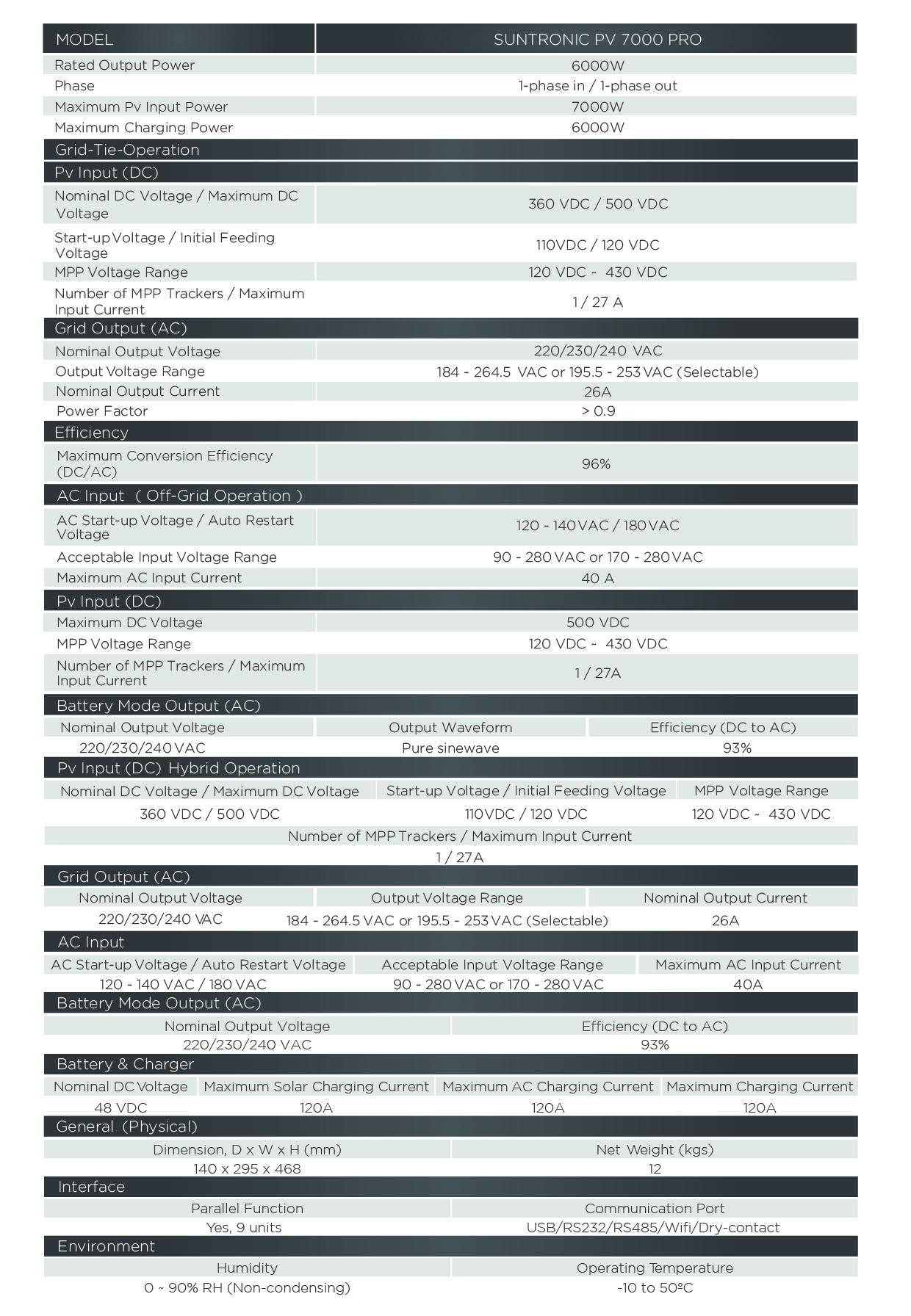 The Suntronic PV7000 Pro is a high-efficiency solar inverter designed for strong energy management in homes and businesses. It offers 7000W PV input power and 6000W output power, with a maximum charging power of 6000W. The inverter has a 360V nominal DC voltage, 500V max DC voltage, and starts at 110VDC.