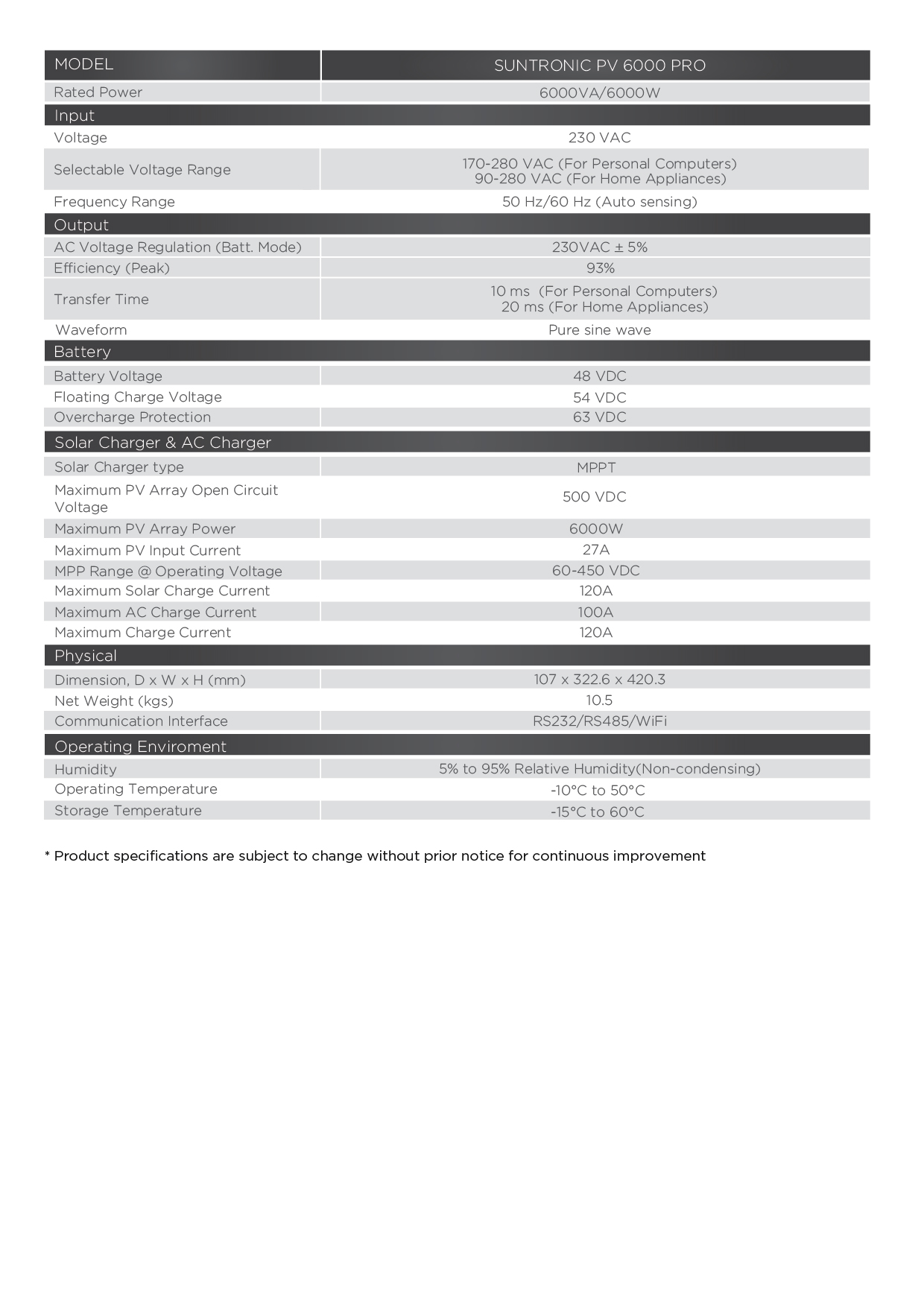 The Suntronic PV6000 Pro is a strong solar inverter for homes. It provides reliable power with a 6000W capacity and 93% efficiency. The MPPT technology helps get the most energy from solar panels, even when sunlight changes.