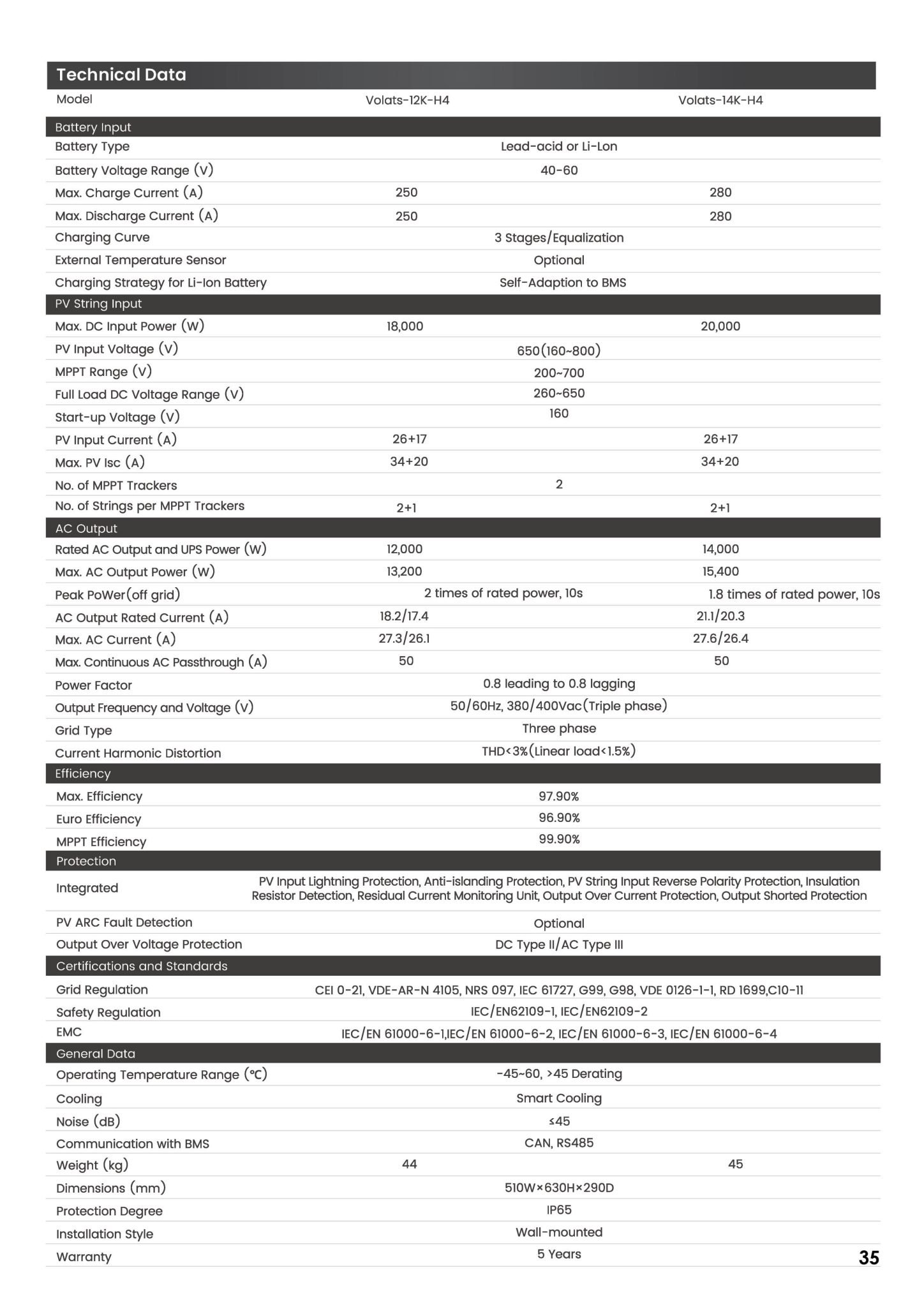 Safety features include integrated PV ARC fault detection, output over-voltage protection, and more, ensuring comprehensive protection. With a maximum efficiency of 97.90% and an IP65 rating, the Voltas 14K-H4 delivers reliable performance in various environments. Backed by a 5-year warranty, this inverter is designed for durability and efficiency, making it a smart investment for sustainable energy solutions.