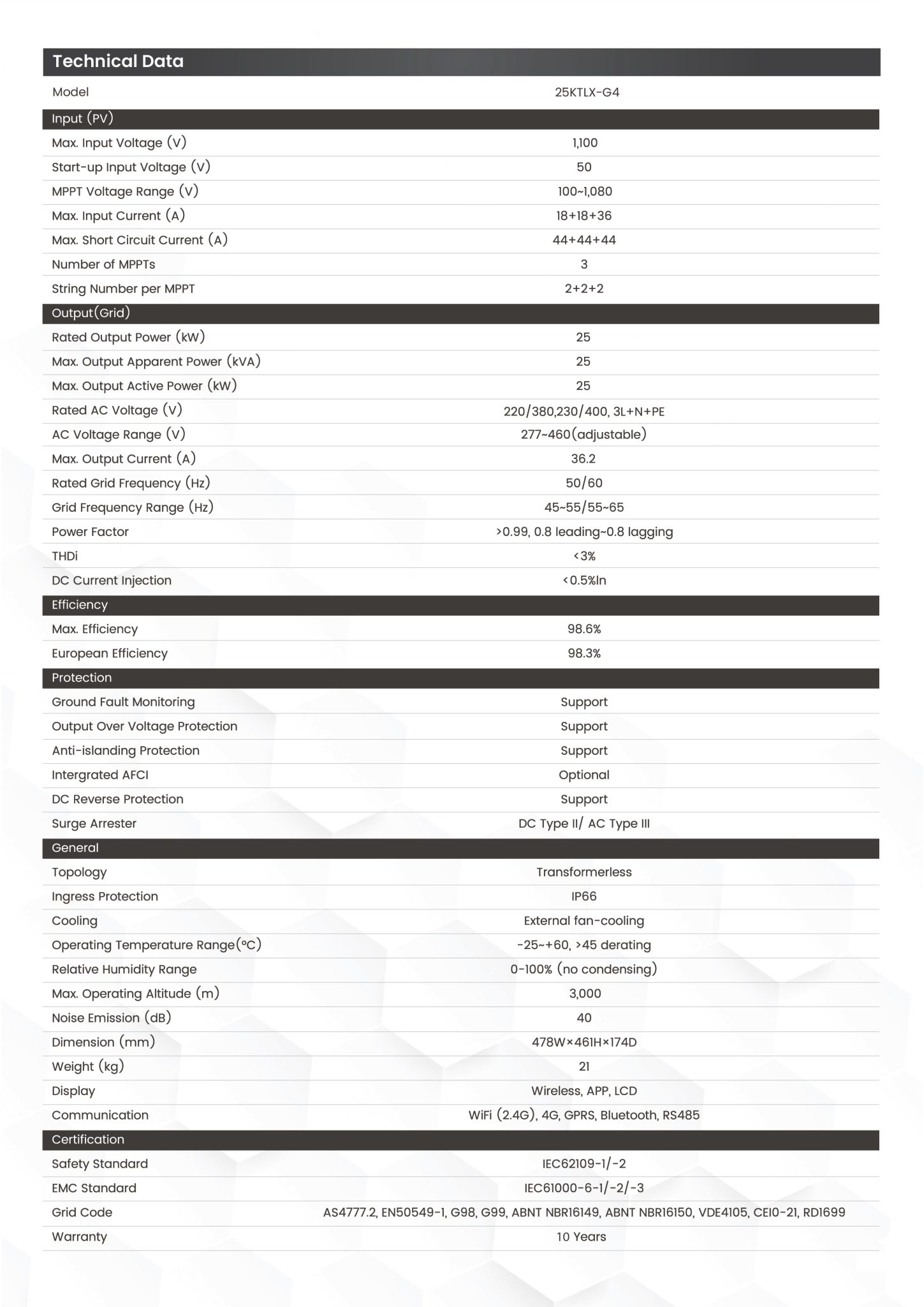 The Voltas 25KTLX-G4 is a high-capacity three-phase on-grid inverter tailored for large-scale energy systems. A rated output power of 25kW ensures consistent commercial and industrial application performance. Its maximum input voltage of 1,100V and wide MPPT range of 100-1,080V enable optimal solar energy utilization.